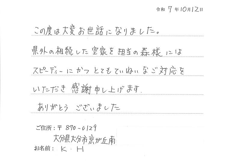 この度は大変お世話になりました。 県外の相続した空家を担当の森様には スピーディーにかつとてもていねいなご対応を いただき感謝申し上げます。 ありがとうございました。