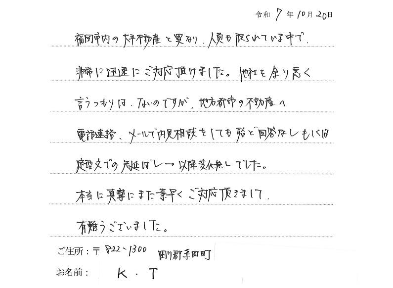福岡市内の大手不動産と異なり、人員も限られている中で、 非常に迅速にご対応頂けました。他社を余り悪く 言うつもりはないのですが、地方都市の不動産へ 電話連絡、メールで内見相談をしても殆ど回答なしもしくは 定型文での先延ばし→以降変化無しでした。 本当に真摯にまた素早くご対応頂きまして、 有難うございました。