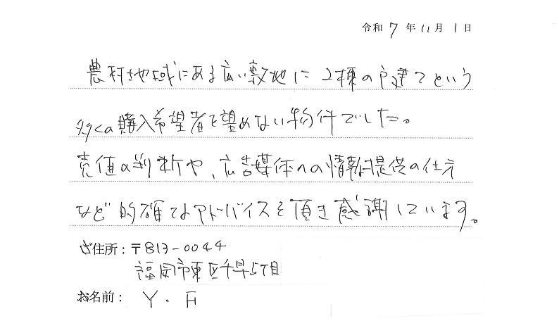 農村地域にある広い敷地に2棟の戸建てという 多くの購入希望者を望めない物件でした。 売値の判断や、広告媒体への情報提供の仕方 など的確なアドバイスを頂き感謝しています。