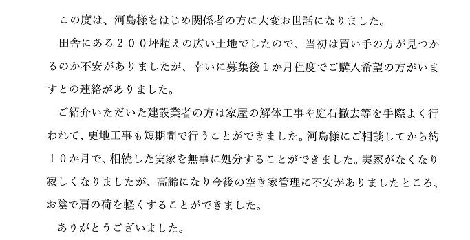 この度はありがとうございました。 感想は、別紙のとおり同封致します。 これから先に、今回と同様の機会がありましたらその節は 宜しくお願いします。 今後のご活躍を祈念致します。 (別紙) この度は、河島様をはじめ関係者の方に大変お世話になりました。 田舎にある200坪超えの広い土地でしたので、当初は買い手の方が見つか るのか不安がありましたが、幸いに募集後1か月程度でご購入希望の方がいま すとの連絡がありました。 ご紹介いただいた建設業者の方は家屋の解体工事や庭石撤去等を手際よく行 われて、更地工事も短期間で行うことができました。河島様にご相談してから約 10か月で、相続した実家を無事に処分することができました。実家がなくなり 寂しくなりましたが、高齢になり今後の空き家管理に不安がありましたところ、 お陰で肩の荷を軽くすることができました。 ありがとうございました。