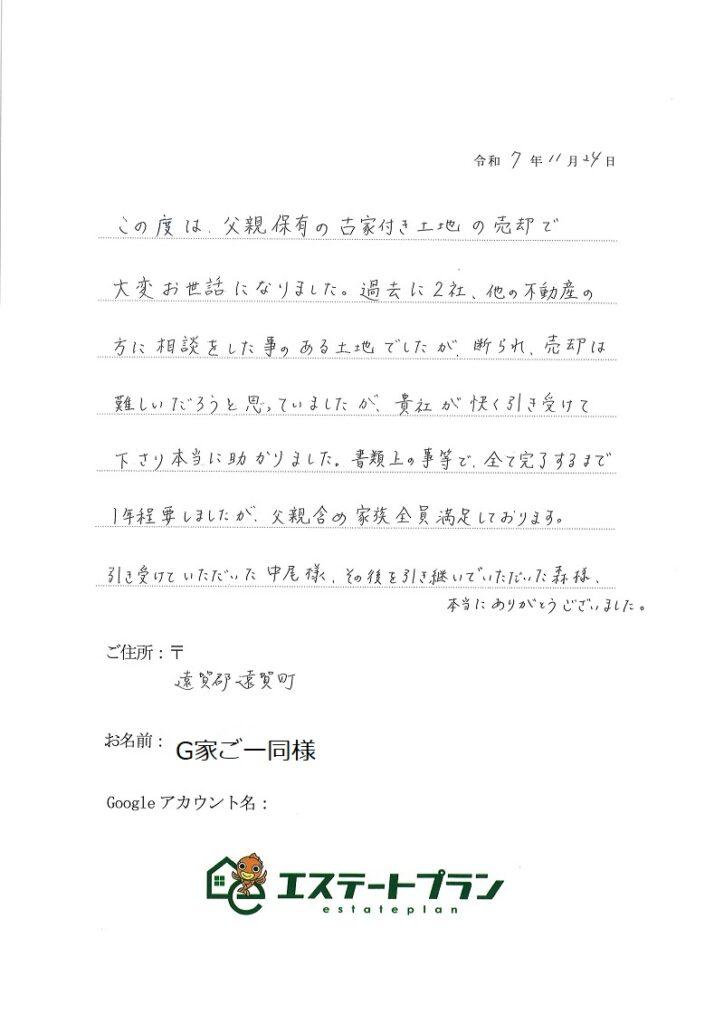 この度は、父親保有の古家付き土地の売却で 大変お世話になりました。 過去に2社、他の不動産の 方に相談をした事のある土地でしたが、断られ、売却は 難しいだろうと思っていましたが、貴社が快く引き受けて 下さり本当に助かりました。書類上の事等で、全て完了するまで 1年程要しましたが、父親含め家族全員満足しております。 引き受けていただいた中尾様、その後を引き継いでいただいた森様、 本当にありがとうございました。