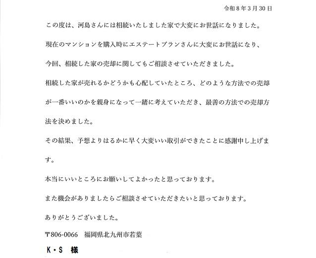 この度は、 河島さんには相続いたしました家で大変にお世話になりました。 現在のマンションを購入時にエステートプランさんに大変にお世話になり、 今回、 相続した家の売却に関してもご相談させていただきました。 相続した家が売れるかどうかも心配していたところ、 どのような方法での売却 が一番いいのかを親身になって一緒に考えていただき、 最善の方法での売却方 法を決めました。 その結果、予想よりはるかに早く大変いい取引ができたことに感謝申し上げま す。 本当にいいところにお願いしてよかったと思っております。 また機会がありましたらご相談させていただきたいと思っております。 ありがとうございました。
